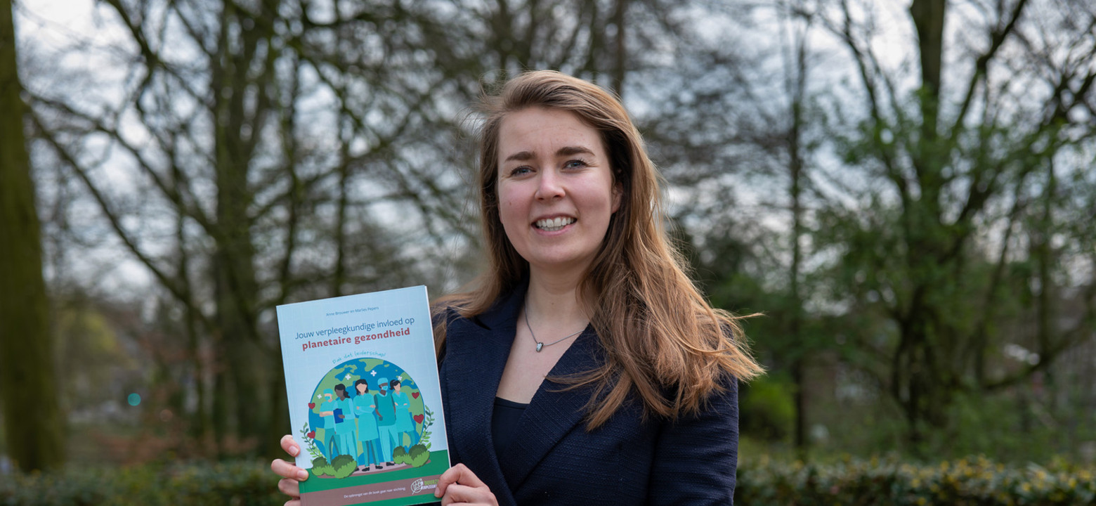 Marlies Pepers met het boek ‘Jouw verpleegkundige invloed op planetaire gezondheid', dat ze schreef samen met Anne Brouwer. Foto: Thomas Busschers.