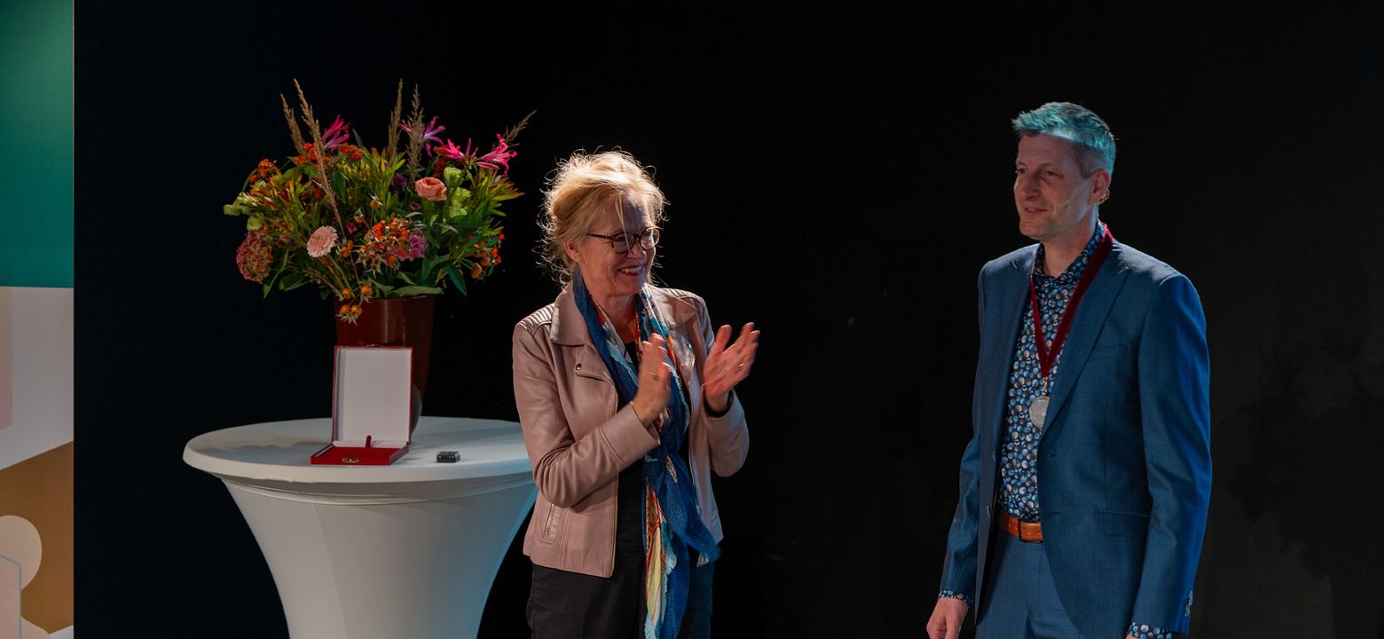 Steven Dorrestijn heeft zijn 'lectorale penning' omgehangen gekregen door Anka Mulder, voorzitter van het College van Bestuur van Saxion.