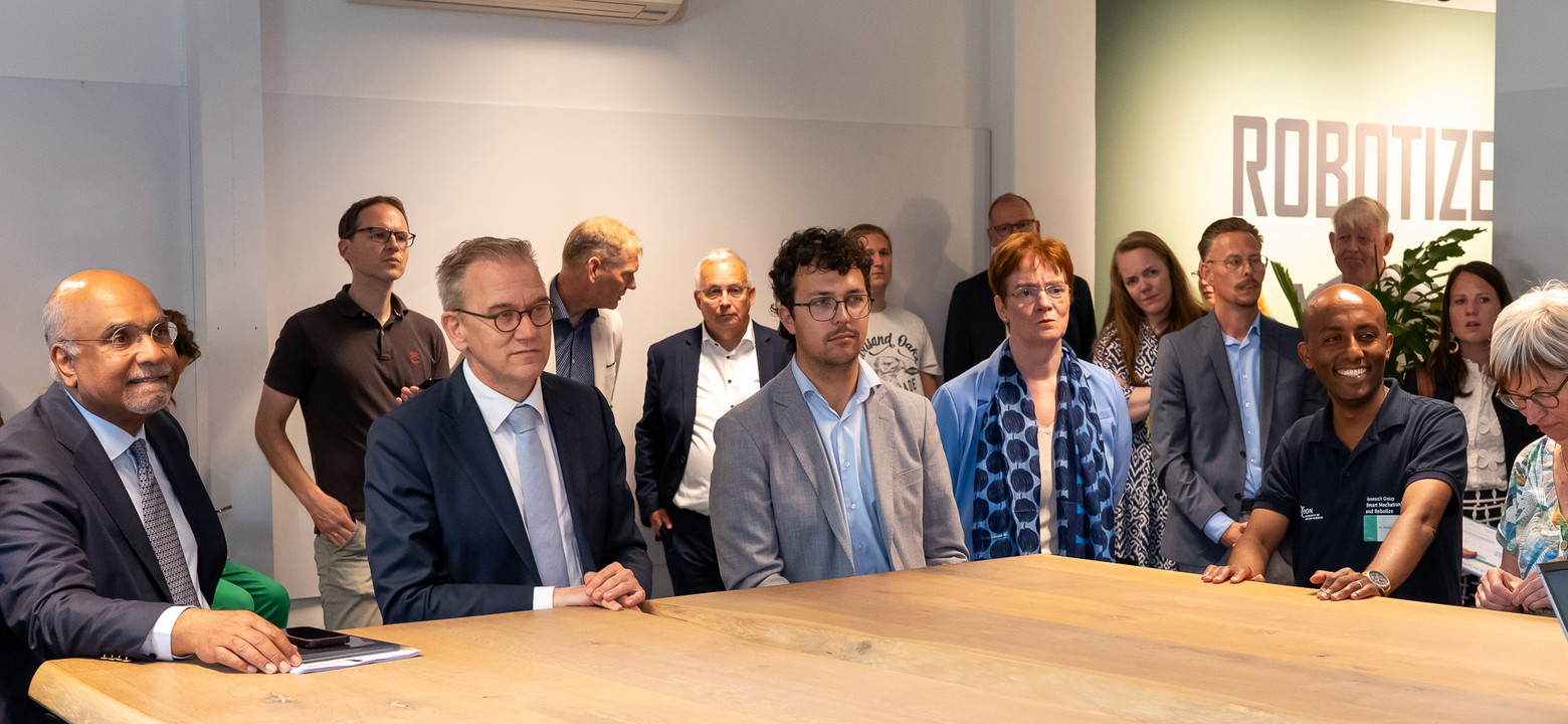 Hij was nog maar net binnen of Eppo Bruins werd door Abeje Mersha, lector Smart Mechatronics & Robotics, uitgedaagd om zich een drone voor te stellen die zorgt voor het technisch onderhoud van een offshore windmolenpark. Er volgde een rondleiding langs diverse technologische hoogstandjes, die de minister meermaals een ‘wouw’ ontlokten.