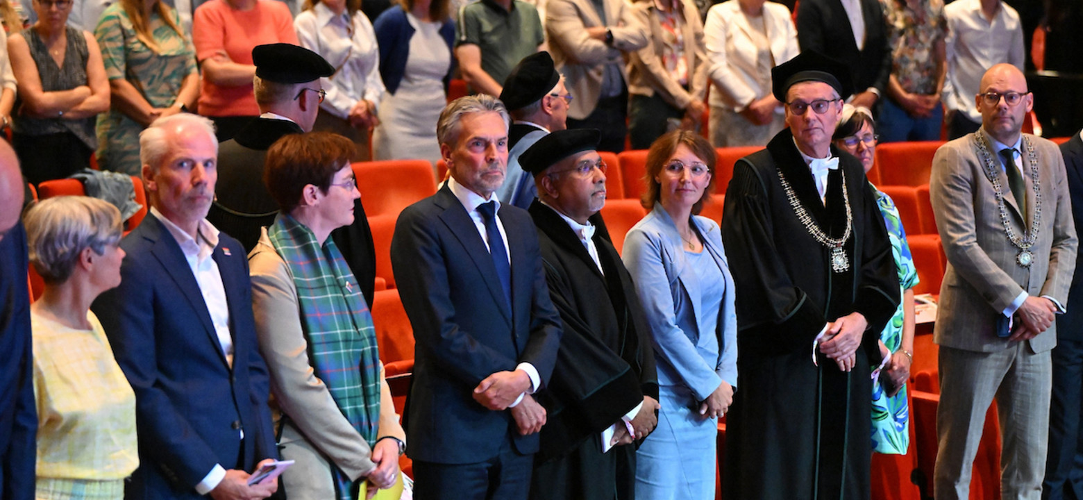 Samenwerking is belangrijker dan ooit. Dat is iets wat heel duidelijk werd tijdens de Opening van het Hogeschooljaar en het Academisch jaar in het Wilminktheater. Het was een opening die een vol programma kende, met prijsuitreikingen, kritische kanttekeningen en zelfs een rap in het teken van het zevenhonderdjarig bestaan van Enschede. Een verslag vanuit een zaal met vele burgemeesters, één minister-president en zowel protestklanken als hoopvolle geluiden.
