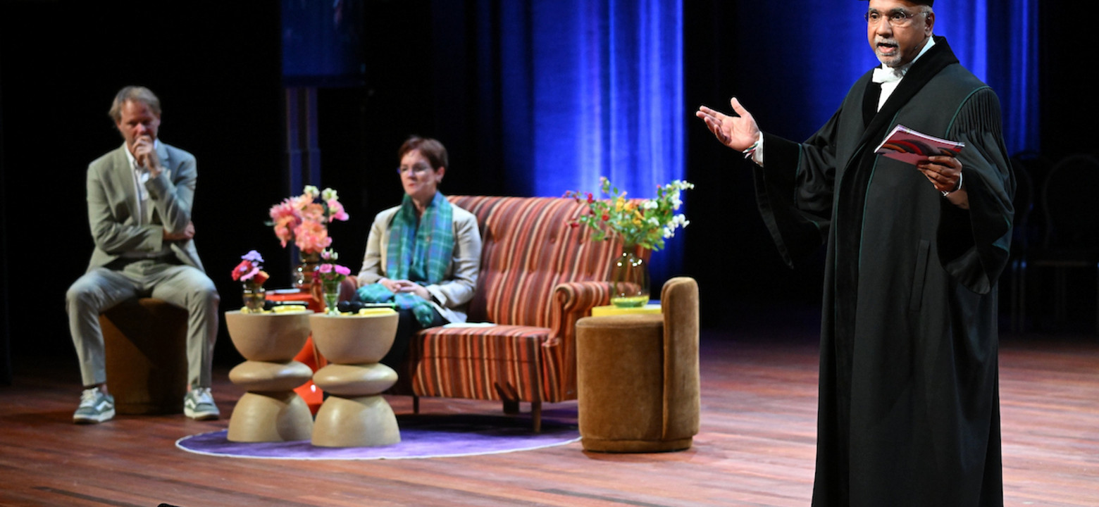 Vinod Subramaniam aan het woord, met op de achtergrond Inge Grimm en dagvoorzitter Laurens ten Den.