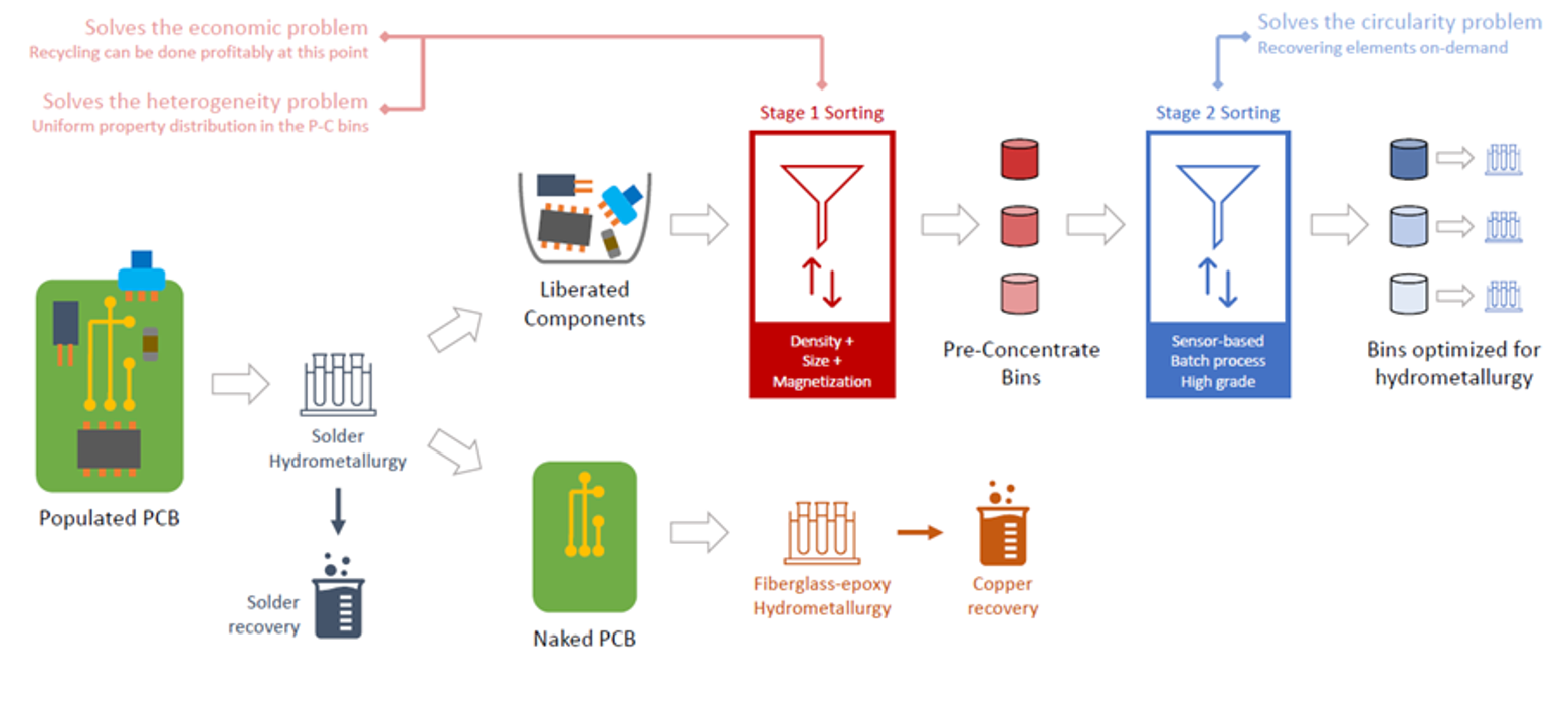 The end-of-life of a printed circuit board (PCB) consists of several recycling processes: e-waste collection, dismantling, sorting, shredding and refining where the valuable metals like Gold, Silver, Copper etc., are finally extracted. At the moment attention is however increasingly brought to critical raw materials (CMRs) other than the high-value precious metals. In the newest iteration of the EU Critical Material Act, the list of materials identified as critical from a supply and strategic viewpoint has grown to 30.