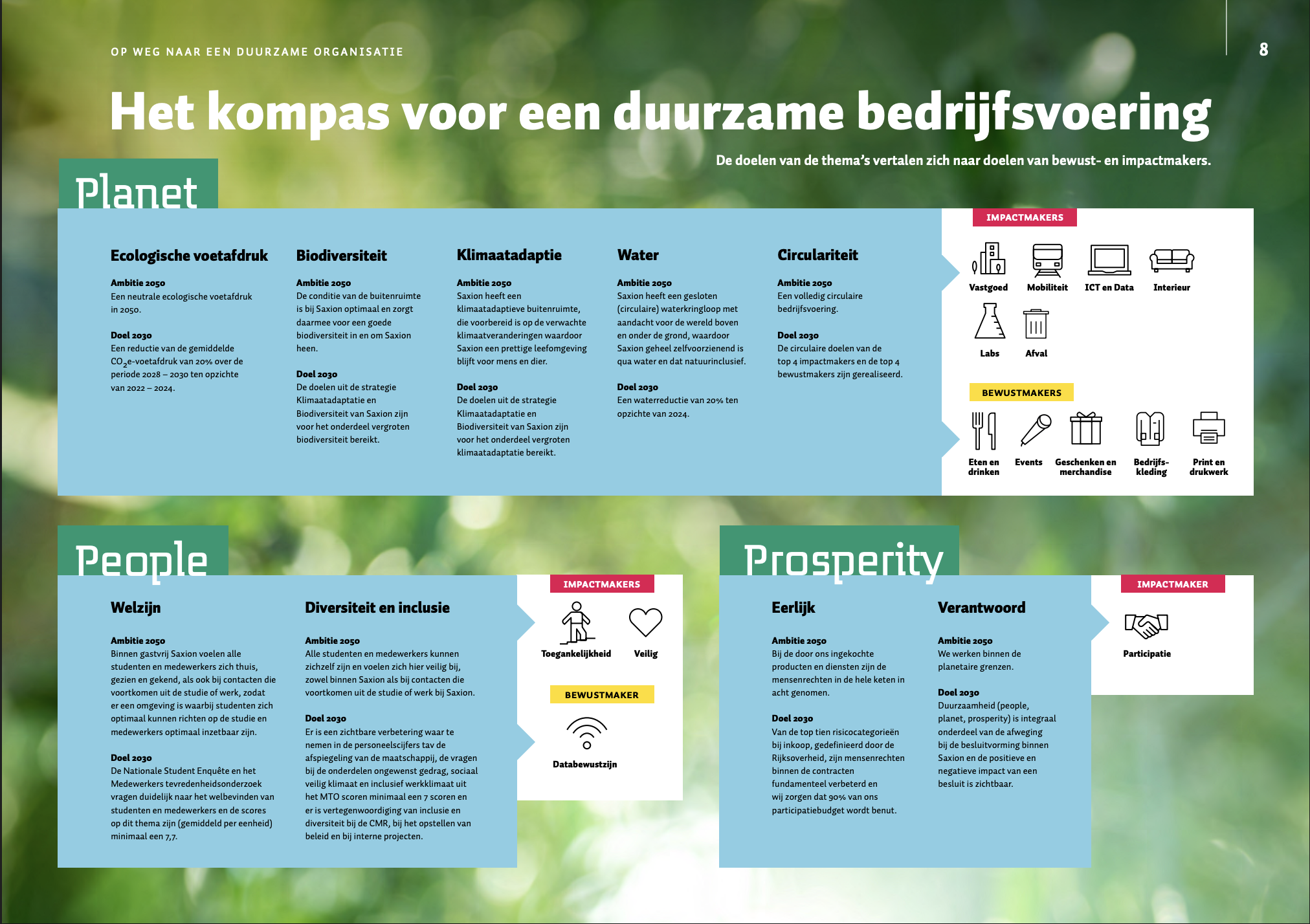 Nederland is over het algemeen rijk en welvarend, maar niet voor iedereen. Volgens het CBS gaat de huidige welvaart steeds meer ten koste van die van toekomstige generaties, waardoor hun brede welvaart dreigt te dalen. Saxion, als mini‑maatschappij met 25.000 studenten en 3.000 medewerkers, herkent dezelfde kansen en uitdagingen op kleinere schaal.